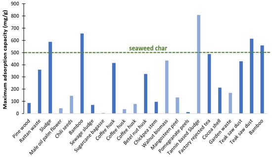 Maximum MB adsorption capacity of char compared with published data for land biomass-derived chars with (dark blue) and without activation treatment (light blue) (data source [47]). The green dotted line presents the maximum MB removal capacity for this work seaweed chars.