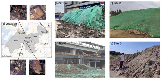 Our study focused on spoil heaps for production and construction projects in the Yangtze River Delta, where real estate and transportation activities are common [14,16] (Figure 1a). This area has a subtropical monsoon climate with an annual average temperature of 14–18 °C and 1000–1500 mm of rainfall [44]. Based on a survey in China by Zhao et al. [24], we studied four types of projects, including real estate, railway, and railway station construction sites, as well as a spoil site. We carried out artificial rainfall simulations on typical spoil heaps that reflect the characteristics of the four projects (Figure 1b–e). The basic information for each spoil heap is shown in Table 1.