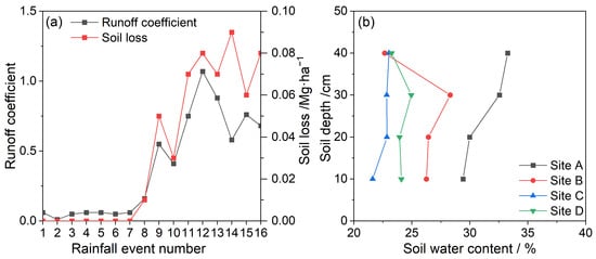 The runoff coefficient and soil loss (a) and the soil vertical moisture distribution (b). Notes: Sites A, B, C, and D are the test plots in the real estate, railway, and railway station construction sites, as well as the spoil site, respectively.