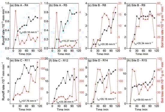 Runoff rate and soil loss rate in the slope erosion process. Notes: Sites A, B, C, and D are the test plots in the real estate, railway, and railway station construction sites, as well as a spoil site, respectively. R4–R15 correspond to rainfall events. I30, maximum rainfall intensity in 30 min.