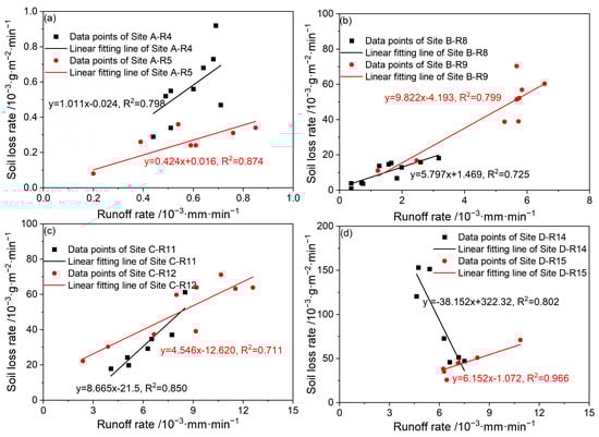 The linear relationships between the runoff rate and soil loss rate. Notes: R4–R15 correspond to rainfall events. (a) real estate construction site; (b) railway construction site; (c) railway station construction site; (d) a spoil site.