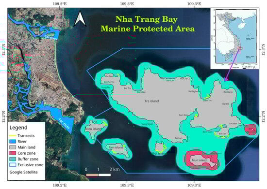 This study was conducted in Nha Trang Bay MPA, the largest multiple-use coastal area in Vietnam. Established in 2002 and covering approximately 160 km2, the MPA aims to conserve coral reefs and other benthic ecosystems within Nha Trang Bay (Figure 1). Located in the East Sea and part of Khanh Hoa Province, the bay is characterized by extensive fringing coral reefs.