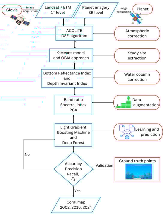 Coral reef changes were tracked through a series of image processing steps (Figure 2), including image acquisition, atmospheric correction (AC), study site extraction, water column correction (WCC), data augmentation, mapping, and model validation. The ACOLITE processor was used for advanced AC, converting image pixels to water surface reflectance. Various WCC techniques and machine learning (ML) models were then applied to satellite images from 2002, 2016, and 2024, depending on the availability of local environmental data.