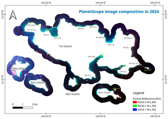 To track coral reef changes, we used PlanetScope imagery for 2016 and 2024, while Landsat was used for mapping coral distribution in 2002 due to the unavailability of Planet data for that year. Planet imagery has a higher spatial resolution (3 m); however, this satellite imagery is constrained by the temporal resolution, with a first retrieved image in 2016 in the Nha Trang MPA. Landsat imagery, on the other hand, presented a very long history of Earth observation since 1972, and hence provided an invaluable dataset for the monitoring of ecosystems worldwide. The use of these two data sources alternatively enabled an accurate mapping of current complex patterns of coral reefs while ensuring the observation of its dynamics in the past. Planet data were retrieved through the Planet Explorer platform (https://www.planet.com/explorer/, accessed on 15 January 2024) under the Education and Research Planet program (Table 1), while Landsat 7 Enhanced Thematic Mapper (ETM+) imagery was downloaded from the United States Geological Survey (USGS) Glovis platform (https://glovis.usgs.gov/, accessed on 22 January 2024) (Table 2). Both datasets were projected to the WGS 84 UTM 49N coordinate system, with PlanetScope images at 3 m spatial resolution and Landsat images at a 30 m spatial resolution.