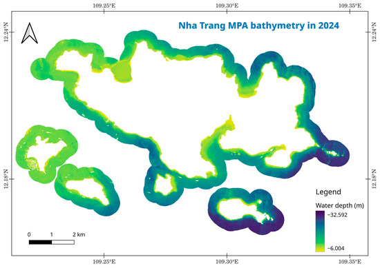 Nha Trang Bay comprises nine islands, seven of which are part of this study site. Hon Tre, the largest island, serves as a natural divider, splitting the bay into northern and southern sections. Until the mid-1990s, the bay was regarded as one of Vietnam’s most biodiverse marine ecosystems, hosting 250 species of Scleractinia corals from 60 genera. It is considered part of the Western Pacific Coral Triangle, a biodiversity hotspot and the origin center for Indo-Pacific coral fauna [29,30]. As Vietnam’s first MPA, it plays a crucial role in marine biodiversity conservation, resource management, and serves as a pilot model for other protected areas in the country [22].