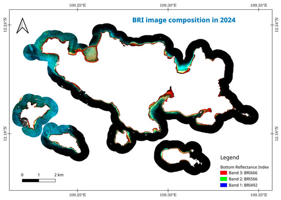 We applied the method of the Bottom Reflectance Index (BRI) for PlanetScope images in 2024 and the Depth Invariant Index (DII) for Planet and Landsat images in 2016 and 2002, respectively. The use of the DII method for 2002 and 2016 images was due to the unavailability of bathymetry datasets, since this meant that we could not calibrate the BRI in the corresponding years.