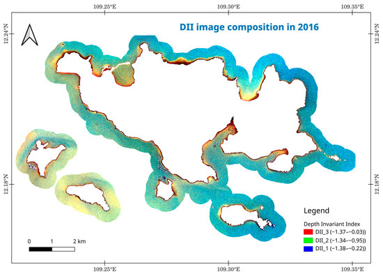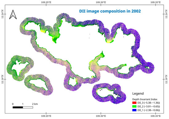 Depth Invariant Index (DII) 3-band (DII_3–DII_2–DII_1) composited image derived from Planet image in 2016. Inside parentheses, numbers indicate DII values for DII_3, DII_2, and DII_1 bands. DII_3 (−1.37–−0.03)).
