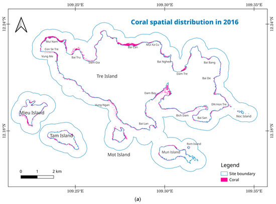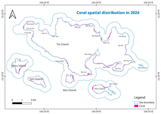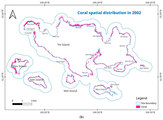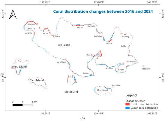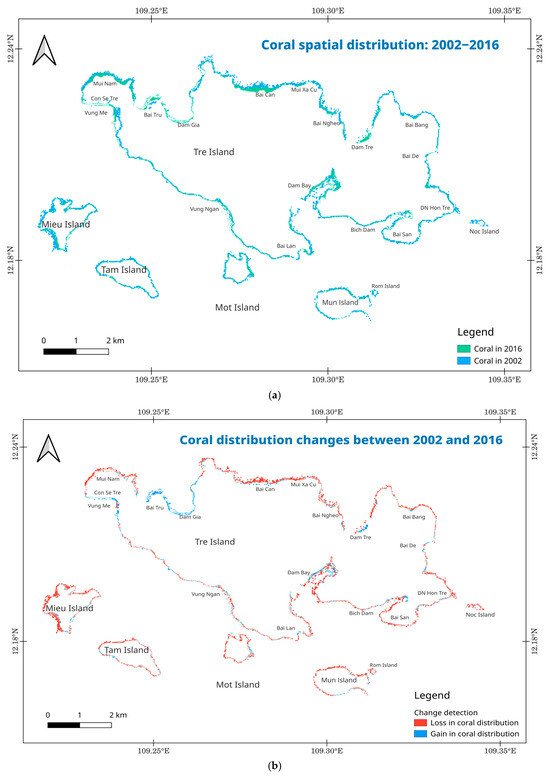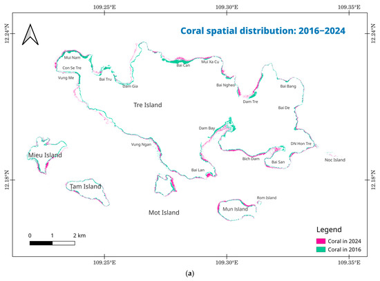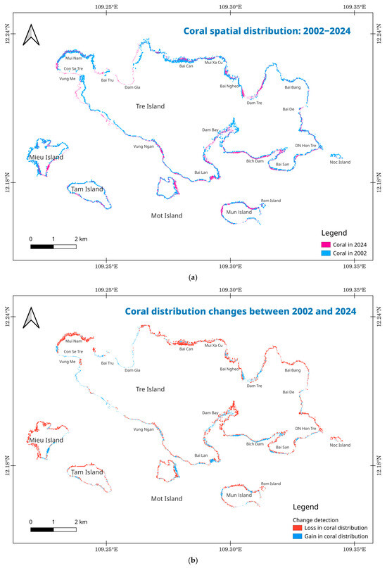 Change detection analysis revealed a total coral loss of 191.38 hectares from 2002 to 2024, with major declines observed around Tre, Mun, Mot, Tam, and Mieu Islands. Notably, 125.06 hectares were lost between 2002 and 2016—nearly double the 66.32 hectares lost during 2016–2024.