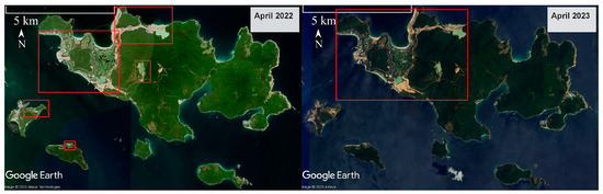 To isolate the study area from land, we applied an unsupervised image classification method (K-Means) to distinguish water and land classes. GIS techniques were then used to create a 500 m buffer zone, defining the study area as extending 500 m from the land boundary (Figure 3). The extent and shape of the study area varied across 2002, 2016, and 2024 due to significant land-use changes. The 500 m limitation was chosen based on coral distribution observed in field surveys, published research [27,28], and the maximum light penetration depth (approximately 20 m), allowing for effective use of multispectral bands in coral mapping.