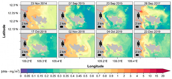 - Hieu, N.T.D.; Tri, N.-Q.; Huan, N.H.; Dien, T.D.; Tran, N.D.H.; Lien, N.P.; Van, T.T. Estimating the Chlorophyll-a in the Nha Trang Bay using Landsat-8 OLI data. IOP Conf. Ser. Earth Environ. Sci. 2023, 1226, 012010. [Google Scholar] [CrossRef]