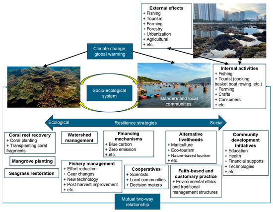 In Nha Trang Bay MPA, understanding both current and future drivers of ecosystem change—including coral disease outbreaks, land-use shifts, trade patterns, and fishing practices—is crucial for prioritizing and adapting management actions that sustain ecosystems and human well-being. This includes identifying and prioritizing actions that enhance system resilience, such as protecting processes and species that support the system’s ability to withstand and recover from disturbances. Key actions include mitigating threats (e.g., controlling pollution, sedimentation, and overfishing), supporting ecosystem processes (e.g., recruitment and recovery) by managing herbivore populations and improving water quality, and fostering alternative livelihoods to reduce pressure on reef resources [55]. We recommend the following points to ensure the long-term resilience of social-ecological systems amid climate change: