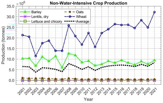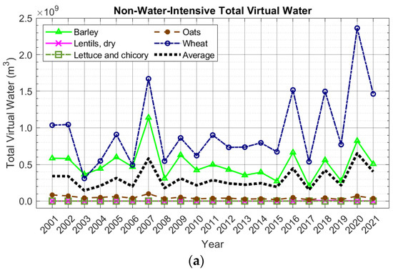 Figure 8 shows total virtual water consumed per year associated with crop production. Total virtual water (VW) refers to the overall water consumption associated with crop production, measured in cubic meters (m3). Wheat and barley are the crops with the highest total virtual water consumption in agriculture. Among non-water-intensive crops, wheat stands out as the largest contributor to this consumption. The patterns of water usage for both wheat and barley show significant synchronization, with distinct peaks occurring in specific years, particularly in 2007, 2016, 2018, and 2021. Before 2010, lentils were associated with relatively low total virtual water usage, reflecting sustainable cultivation practices. However, around 2011, there was a noticeable upward trend in the virtual water used for lentil production. This increase reached a peak between 2017 and 2020, likely driven by factors such as an expansion in lentil farming areas or a decline in water efficiency in cultivation systems. Since 2018, lentils have been the only crop to show a continuous decline in virtual water volume. Lettuce and chicory exhibit the lowest overall virtual water consumption, showcasing remarkable water-use efficiency compared to other non-water-intensive crops. Between 2013 and 2018, there was a slight increase in total virtual water usage for these crops, followed by a downward trend, indicating ongoing improvements in their water conservation practices. Barley, oats, and wheat show similar patterns in virtual water usage throughout the year. In contrast, dry lentils, lettuce, and chicory exhibit complementary trends; when the virtual water consumption of dry lentils decreases, the usage of lettuce and chicory increases. Oats show a relatively stable growth and production pattern, requiring moderate water consumption similar to barley. This stability is characterized by only minor fluctuations over the years, notably in 2008, 2015, and 2021. In summary, wheat and barley have the highest total water consumption among crops because of their extensive cultivated areas and high yield demands. In contrast, lentils have experienced increased water usage since 2010, likely because of expanded production or changes in efficiency. Lettuce and chicory are the most water-efficient crops, maintaining low consumption levels. Oats show stable water usage patterns, similar to those of wheat and barley. Overall, while lentils’ virtual water consumption has risen, effective water management since 2018 has helped stabilize consumption across various crops.