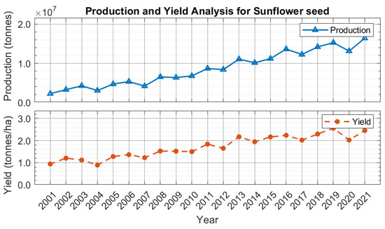 Figure 3 illustrates a clear upward trend in the production and yield of sunflower seed. From 2001 to 2021, sunflower seed production steadily increased because of growing market demand and expanded cultivation. Initially stable, production rose significantly over time as agricultural techniques improved and farming areas expanded. By 2021, production exceeded 15 million tonnes, reflecting enhanced yield efficiency and interest in sunflower cultivation. Although yield shows consistent growth, the increase is less steep compared to production. This suggests that a portion of the production growth may be because of the expansion of cultivated land rather than yield efficiency alone. Rising yields, which show an upward trend with some fluctuations, account for the increase in production. This growth is likely due to improved efficiency, as indicated by a higher yield per hectare, as well as the expansion of sunflower seed farming areas. The increased yields imply advancements in seed varieties, irrigation techniques, and overall farming practices.