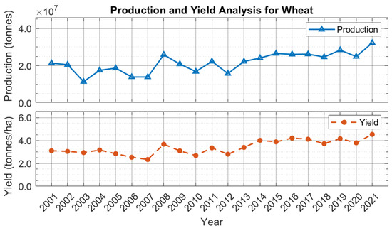 Figure 4 analyzes the trends in wheat production and yield from 2001 to 2021 based on the obtained data to report an overall growth in wheat production, with significant fluctuations and consistent yield improvements post-2009. Wheat production has experienced several peaks and declines, particularly in the years 2003, 2006, 2010, and 2012, typically following a cycle of 2–3 years. Despite these fluctuations, overall production increased from approximately 20 million tonnes in 2001 to 33 million tonnes by 2021. In the earlier years, from 2001, yields gradually decreased, fluctuating between 2.0 and 3.0 tonnes per hectare. However, starting in 2010, yields improved steadily, reaching nearly 4.5 tonnes per hectare by 2021. The fluctuations in wheat production, which correspond to changes in yields, highlight the potential impact of land use changes.