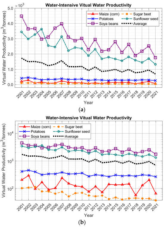 Annual virtual water usage of water-intensive crops [m3] in Ukraine (2000–2021) for maize (corn), potatoes, soybeans, sugar beets, sunflower seeds, and their average productivity: (a) linear- and (b) log-scales.