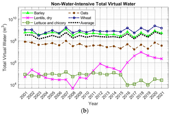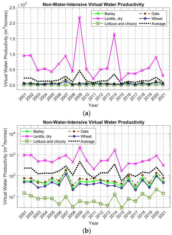 Annual virtual water usage of non-water-intensive crops [m3] in Ukraine (2000–2021) for barley, dry lentils, lettuce and chicory, oats, wheat, and their average virtual water: (a) linear- and (b) log-scales.
