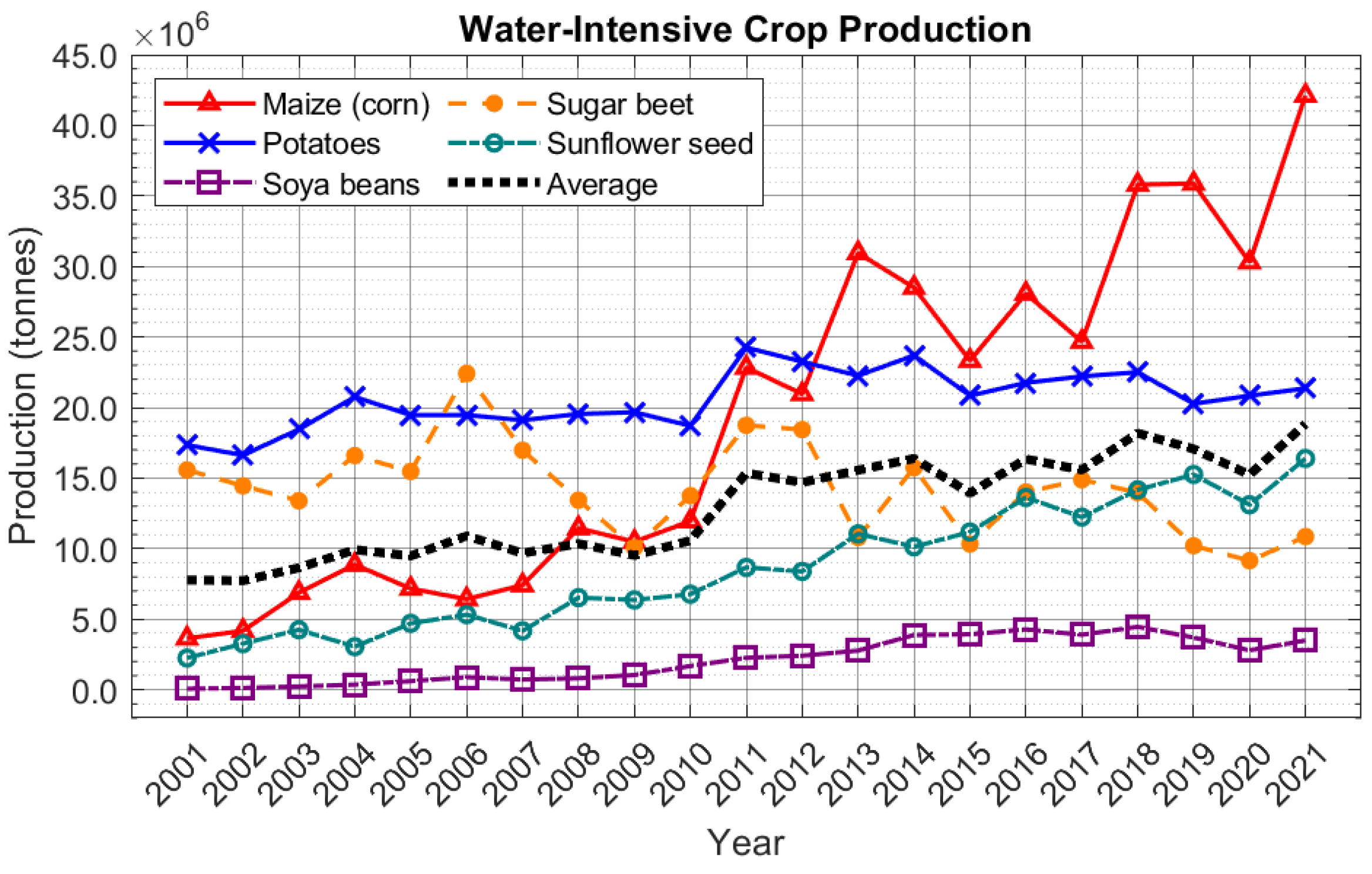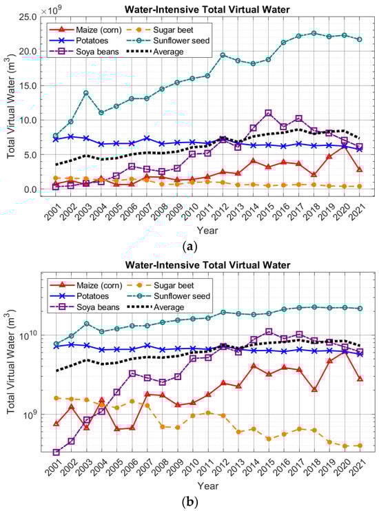Figure 7 outlines the total virtual water trend for water-intensive crops, i.e., the total water consumption linked to crop production, measured in cubic meters (m3). Sunflower seeds have emerged as a leading crop in terms of total virtual water usage, surpassing all other agricultural products. From 2001 to 2016, there was a consistent increase in virtual water consumption, indicating a significant growth in sunflower seed production. However, between 2016 and 2021, this growth trend stabilized, suggesting that, while the area cultivated with sunflowers likely expanded, the overall water demand reached a more sustainable level compared to other crops. This pattern highlights the complex relationship between crop cultivation and water resources, emphasizing the importance of sunflowers in the agricultural landscape. Over the years, the total virtual water associated with potato production has remained relatively constant, reflecting a steady approach to both cultivation practices and water management. This stability implies that farmers are employing reliable and consistent water consumption patterns in potato farming, ensuring the sustainable use of water resources throughout various growing seasons. Between 2005 and 2018, soybean production showed a significant surge, leading to a notable increase in total virtual water usage related to this crop. This period of rapid expansion underscores the growing demand and improved cultivation practices within the soybean sector. As its production is the second largest among other crops, soybeans’ recent decline in virtual water consumption noticeably contributed to the total virtual water consumption. The peak in virtual water consumption occurred around 2018 to 2019, coinciding with heightened soybean production efforts. However, this upward trend did not continue, as a decline was observed from 2020 to 2021, which requires more in-depth socio-economic and political understanding. Maize, commonly referred to as corn, exhibits significant variability in its overall virtual water consumption. This variability is marked by sharp peaks during certain periods and substantial dips in others. Following 2010, there has been a clear upward trend in total water consumption associated with maize production. Nonetheless, the persistent variability indicates inconsistent production patterns. The trend in sugar beet cultivation shows a unique noticeable decline over the years. Specifically, there has been a gradual reduction in total virtual water consumption associated with this crop, which has been particularly clear since 2019.