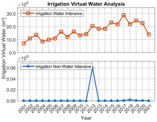 The annual sum of irrigation virtual water for both water-intensive and non-water-intensive crops [m3] in Ukraine (2000–2021).