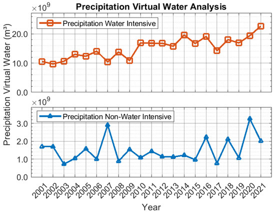 Figure 11 shows the precipitation virtual water usage in crops, indicating the volume of rainwater that supports crop production. From 2001 to 2021, the contribution of precipitation to virtual water rose significantly, increasing from about 10 B cubic meters to 22 B cubic meters. This trend suggests either increased rainfall in key agricultural areas or a larger area dedicated to growing water-intensive crops that depend on this natural precipitation. Notably, years such as 2007, 2009, and 2017 experienced drops in precipitation volume. These declines might be because of climate variability or reduced reliance on rain-fed agriculture at those times. However, subsequent years have shown recovery in rainfall levels, highlighting the influence of natural climate cycles. Non-water-intensive crops show significant fluctuations in performance, highlighted by distinct peaks and valleys. These variations show a strong sensitivity to annual rainfall patterns. Years with substantial rainfall—like 2007, 2010, 2016, 2018, and 2020—result in notable productivity peaks. Conversely, poor performance in other years suggests challenges because of inconsistent rainfall, often leading farmers to use irrigation. Unlike water-intensive crops, non-water-intensive crops do not display a consistent long-term trend in water usage related to rainfall. This inconsistency may be because of the variability of farming practices, changes in cultivation areas, or a reduced focus on these crops during certain periods.