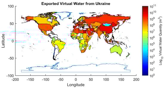 The global distribution of Ukraine’s exported virtual water flows in Log-scale [m3] associated with agricultural goods, aggregated over the period 2000–2021.