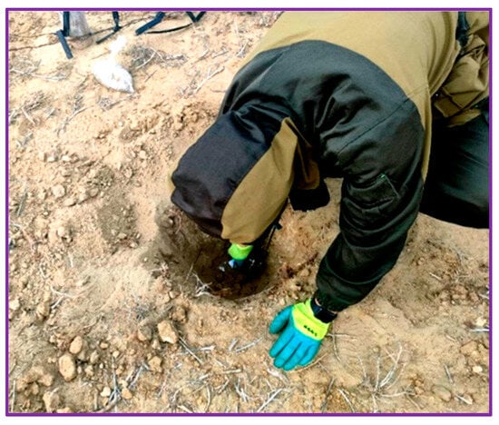 The field studies verified the aquifer segment locations, including water and soil samples, and the geotechnical condition of the wells assessed. The sampling plan was prepared based on the study aims, standard behavior at the sampling sites, as well as issues of possible hazards. Taking into account the enormous size of the region under study, its accessibility (only in summer), and the location of the water intakes intended for irrigation, a plan was adopted for the one-time point sampling of the water from wells and soils in irrigated areas from a given well. The soil salinity was determined in test plots around the groundwater intakes. Sample plots were selected by consulting local farmers and agricultural authorities and were required to be typical for the study area as well as homogeneous in terms of the degree and type of soil salinity. The sampling was carried out with soil augers at the corners and in the center of the irrigated area under study, using the point sampling “envelope” method at the rate of one plot per 100 ha of an irrigated field. Soil samples were collected at a depth of 0–20 cm and 20–50 cm in a continuous column throughout the entire sampling interval (Figure 2).