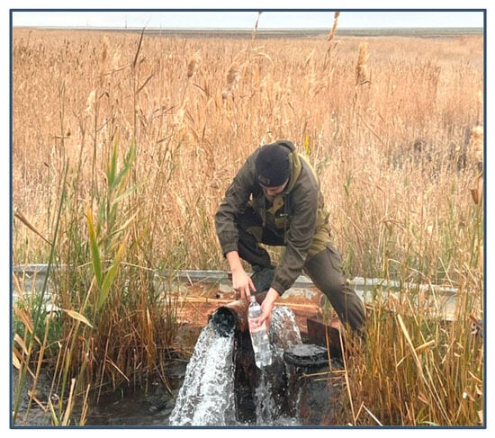 The soil and water sampling procedures were performed according to the Republic of Kazakhstan’s standard methods for monitoring and assessing irrigated land reclamation conditions. Historical information on agricultural land reclamation conditions was obtained from the Kazakh Ministry of Agriculture’s database [43]. The field testing included the selection and preparation of water points for sampling, the sampling and preservation of samples, and the visual determination of suspended and emulsified substances and insoluble sediments directly at the water source. Since the object of study was artesian self-flowing groundwater, there was no need for preliminary pumping from the wells. The use of groundwater confined to deep-lying aquifers predetermined the practical absence of seasonal fluctuations in their chemical composition. Water samples were collected in sterile 150 mL plastic bottles. The bottles were rinsed three times with the sample water. The bottles were then filled within four cm from the top and immediately closed to avoid air impact. Each bottle was labeled for identification. The bottle samples were then placed into a cooler with ice for laboratory delivery within one day. All chemical analyses were performed by the chemical laboratory of the Ahmedsafin Institute of Hydrogeology and Environmental Geoscience (Accreditation Certificate No. KZ.T.02.0782, valid until 27 November 2025). The chemical water sample analysis was conducted via a Mettler-Toledo liquid analyzer to measure the pH, conductivity, and dry residue. The sodium and potassium levels were determined with a PFP-7 flame photometer. Dissolved calcium, magnesium, nitrite, sulfate, chloride, and fluoride were measured using a Capel 105 M capillary electrophoresis (National Standard ST RK GOST R 51232) [44].