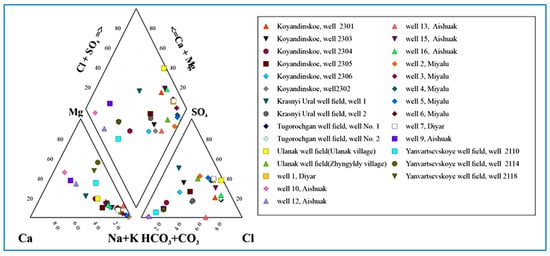 The water sample anion and cation concentrations are shown in Figure 4 (Piper diagram [64]) and in Figure 5 using Durov’s diagram [65]. The chemical data depicted in the Piper diagram reveal various groundwater types, including Na-K-Cl, Ca-Cl, Ca-Mg-HCO3, mixite Ca-Na-Mg-HCO3, and Ca-Na-Cl. Durov’s diagram reflects the correlation between different anions and cation concentrations, pH values, and TDS. The fresh and ultra-fresh groundwater of the north Aishuak, Yanvartsevskoye, and Krasnouralskoye well fields is hydro-carbonate calcium–magnesium. The more saline groundwater of the other aquifers have chloride–sulfate, sulfate–chloride–hydrocarbonate sodium, and sodium–calcium compositions.