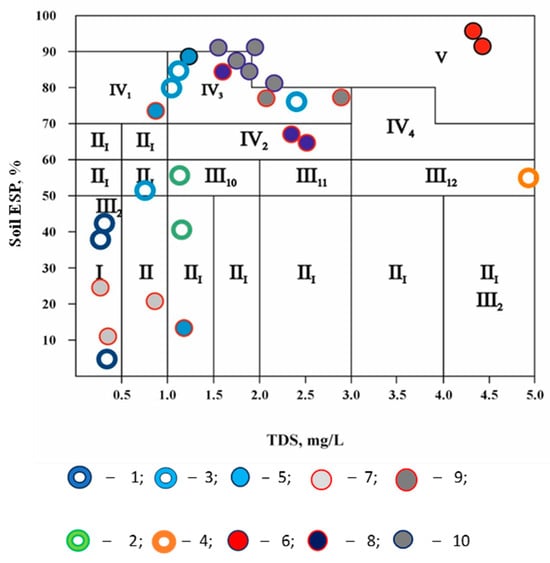 The assessment of the suitability of the water for irrigation depends not only on the composition of dissolved salts, but also on the type of soil and the plants grown. On easily permeable and well-drained soils, more mineralized water can be used, while on heavy soils with poor drainage, the salt content standards are reduced (Table 6). The irrigation water quality assessment according to the degree of soil salinity and the soil granulometric composition is described in Section 3.2.