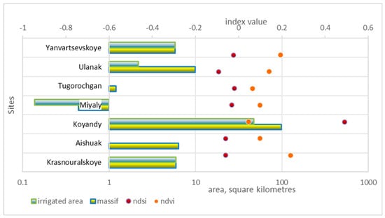 The NDVI calculation is based on the two most stable (independent of other factors) parts of the plant’s reflection spectral curve. In the visible region (0.4–0.7 µm), the maximum solar radiation absorption by chlorophyll occurred. In the infrared region (0.7–1.0 µm), the maximal leaf cellular structure reflection region was found. This is associated with a high photosynthetic activity, typically observed in dense vegetation, which leads to less reflection in the visible spectrum and more reflection in the infrared spectrum. The interrelationship of these indicators enables a clear distinction and analysis of the vegetation from other natural objects. Furthermore, recognizing vegetation types is also possible by the sub-satellite normalized difference between the minimum and maximum reflections rather than a simple relationship, which increases the sampling accuracy and reduces external factor effects, such as shading, clouds, haze, and atmospheric radiation absorption [54]. The NDVI is displayed on a standardized continuous gradient or discrete scale, with values ranging from −1 to 0.1, where negative values indicate water and non-living surfaces, while positive values correspond to different levels of vegetation cover [55]. To calculate the NDVI and NDSI, the ArcGIS 10.1 Raster Calculator tool was utilized, which enables the pixel-wise computation of spectral indices based on mathematical expressions. The dataset selection was guided by the phenophase of the cultivated crops and the surrounding environment. For selecting Sentinel-2 data, it is very important to take into account the correspondence between the survey period and the main stages of the vegetation phenophase for the study area [56]. Only cloud-free satellite images from the summer season were used, corresponding to the period when the chlorophyll content in irrigated fields reaches its peak, while the vegetation in the surrounding non-irrigated areas has largely dried out, minimizing the chlorophyll presence. This approach ensured a clear spectral contrast, allowing for an accurate assessment of the vegetation distribution and condition. Based on the commonly accepted ESRI classification of NDVI values, the following classification was used: −1 to 0—water bodies, clouds, and bare rocks; 0 to 0.2—barren soil, sand, and dead vegetation; 0.2 to 0.5—sparse, dry, or degraded vegetation (e.g., steppes and pastures); 0.5 to 0.7—moderately dense vegetation, grasslands, and cultivated crops in mid-growth stages; and 0.7 to 1.0—dense, healthy vegetation (forests and well-irrigated crops).