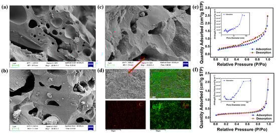 Surface morphology characterizations. SEM images of raw ceramic (a), La-C-450 (b) and La-EPS-C-450 (c), EDS of La-EPS-C-450 (d), and N2 adsorption isotherms and pore size distribution curves of La-C-450 (e) and La-EPS-C-450 (f).