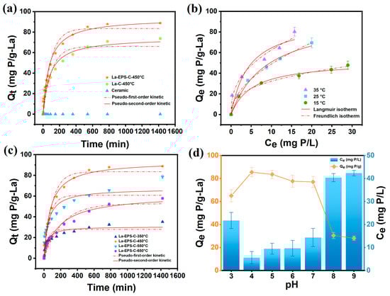 To investigate the phosphorus removal characteristics of the modified ceramics, adsorption experiment kinetic data were analyzed by pseudo-first-order kinetic model and pseudo-second-order kinetic model. Among the materials tested, La-EPS-C exhibited the fastest adsorption rate and the highest adsorption capacity at a carbonization temperature of 450 °C (Figure 2a). The maximum phosphorus adsorption capacity, determined through kinetic model fitting, was 83.51 mg P/g-La. Adsorption equilibrium was achieved within 7 h, after which the adsorption curve plateaued (Figure 2b).