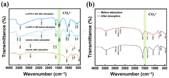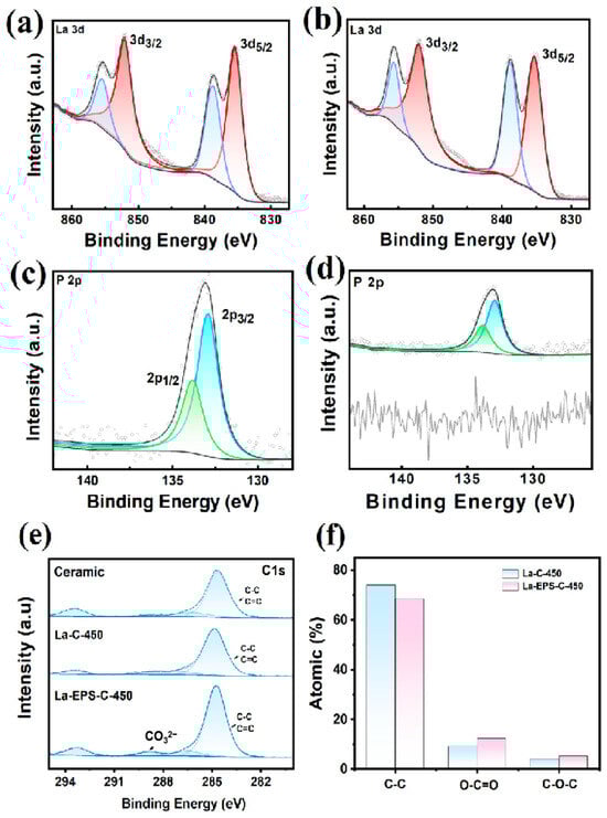 XPS analysis of La 3d before (Figure 4a) and after (Figure 4b) phosphate adsorption showed a shift in binding energy. The La 3d5/2 double peaks shifted to 835.30 and 838.50 eV, and La 3d3/2 peaks shifted to 852.10 and 855.70 eV. This 0.2–0.8 eV shift indicates valence band electron transfer and the formation of inner-sphere recombination between La and P [34,35]. This phenomenon aligns with the La-O-P complex formation observed in FT-IR spectra at 543 cm−1 [25]. After phosphate absorption, the peak intensity of O-C=O peak in FT-IR spectra decreased. This indicates that when phosphate is adsorbed onto La-EPS-C-450, the ligand exchange between phosphate in water and the carbonate group of La-EPS-C-450 occurs [36]. By the peak quantification of the XPS of the carbon atom, a distinct peak near a binding energy of 289 eV was observed (Figure 4e), corresponding to carbonate functional groups. The higher content of carbon carbonate atoms compared to the raw ceramic and La-C-450 suggests that lanthanum may have formed lanthanum carbonate on the ceramic (Figure 4f), which is likely the main active component for phosphorus adsorption [37]. The baseline before adsorption and the significant phosphorus peak after adsorption also indicated that phosphorus was successfully adsorbed (Figure 4d).