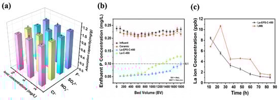 The practical application tests. Effects of interfering ions on the adsorption capacity of La-EPS-C-450 (a), the performance of phosphorus removal by fixed-bed column (b), and the La3+ leakage from La-EPS-C-450 and LMB during the treatment of surface water from Qingshan Lake (c).