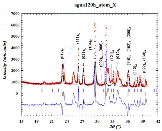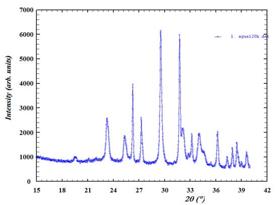 A representative XRD pattern is shown in Figure 2, corresponding to MW after 120 h of magnetization at Quinta Versalles. In Figure 3, the same XRD pattern is presented with an approximate refinement using the Rietveld method. The refinement includes only the diffraction peaks of calcite and aragonite, while additional peaks corresponding to unidentified phases are also visible.