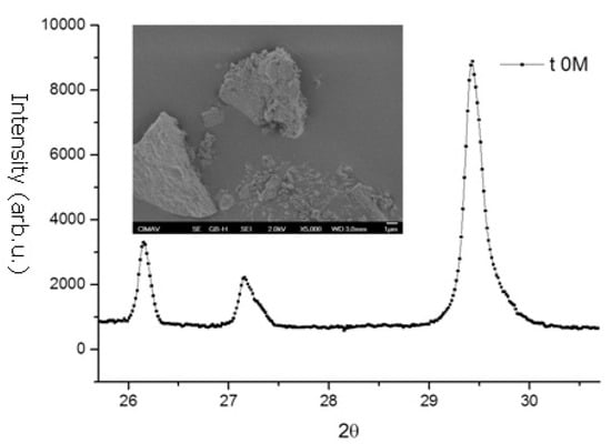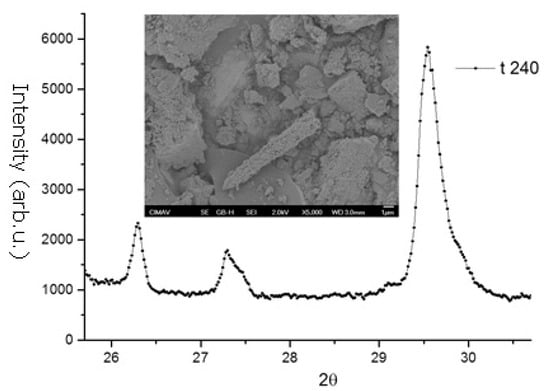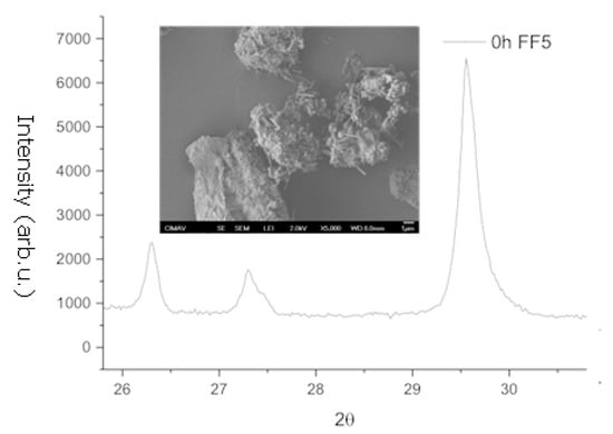 The temporal evolutions of XRD patterns and microstructural changes in MW treated with FF121 magnets at Quinta Versalles are illustrated in Figure 4 (0 h) and Figure 5 (240 h). Each figure highlights the relevant XRD pattern section and includes an SEM image of the precipitates. For reference, calcite precipitates display an equiaxed morphology, while aragonite forms acicular structures.