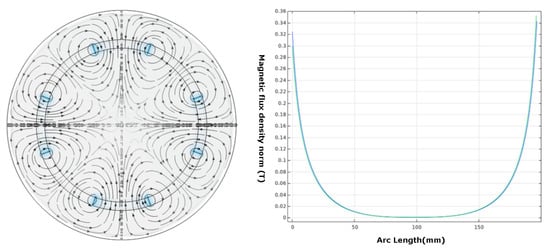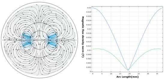 Figure 10 illustrates the force lines of the magnetic field (B), where the tangent at any given point indicates the local field direction. A higher concentration of force lines corresponds to regions of greater magnetic field intensity, whereas a sparse distribution of lines in the central region suggests a significantly weaker field. These results confirm that the magnetic field is non-uniform, exhibiting greater intensity at the periphery and decreasing toward the center.