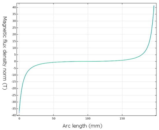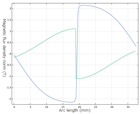 Additionally, Figure 12 shows the magnetic field (B) curves in Tesla. In contrast to the previous configuration, the curves are no longer identical along the z- and y-axes. The results indicate that the magnetic field intensity is highest at the periphery and gradually decreases toward the center.