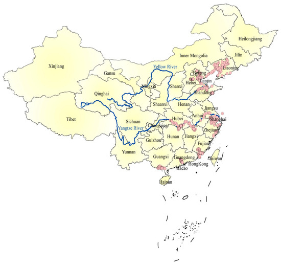 ArcGIS 3.4.2 software was used to geospatially represent the sampling sites on a map of China based on their longitude and latitude parameters (Figure 1). In cases where longitude and latitude parameters were not available, the sampling site names were used to extract the necessary geographical coordinates from Satellite Maps, ensuring accurate spatial representation of the data. The concentrations of PFOA and PFOS were standardized to ng/L for further analysis. Data analysis and meta-analysis were performed using the JMP statistical 14.0 software. The “Y-distribution” platform within JMP was used to summarize the concentration range and average concentration of PFOA and PFOS. Additionally, the “Fit Y by X” platform was used to test for significant differences between PFOA and PFOS concentrations and various environmental factors (pH, DO, salinity, and TOCs).