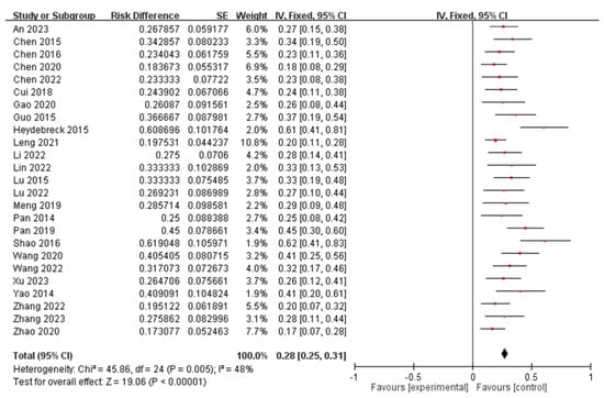 Forest plot for heterogeneity analysis of selected studies (red dots represent the weight of each study, and the diamond represents the combined effect size) [,,,,,,,,,,,,,,,,,,,,,,,,].