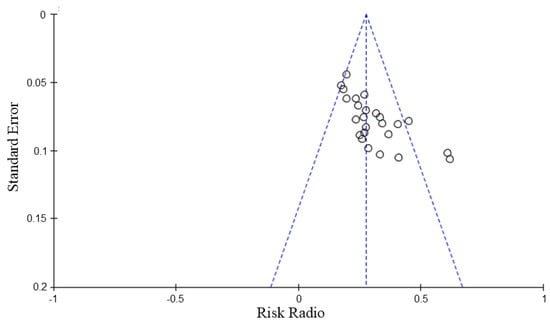 Heterogeneity was determined using the I2 statistic as shown in Figure 2. The I2 value was 48% (less than 50%), indicating low heterogeneity. Therefore, a fixed effect model can be applied to estimate the summary effect size (represented as the mean effect distribution across included studies). In addition, the publication bias was evaluated via funnel plot analysis (Figure 3). The symmetrical distribution of sample points around the midline suggests no significant publication bias in the included studies.