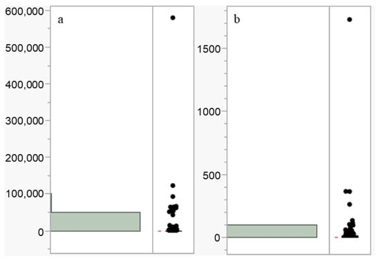 In addition, Figure 4 depicts the mean concentration distribution of PFOA and PFOS in water samples (measured in ng/L), and Table 1 summarizes detailed statistical data on these concentrations. PFOA levels ranged from 0.0001 to 578,970.00 ng/L, with a median concentration of 8.07 ng/L and a mean concentration of 1615.17 ng/L, while PFOS levels ranged from 0.003 to 1725.37 ng/L, with a median of 1.86 ng/L and a mean of 8.41 ng/L. Among the 34 studies reviewed, seven reported PFOA/PFOS concentrations exceeding 300 ng/L at various sampling points, including rivers/lakes such as Dongzhulong River, Baiyangdian Lake, and Xiaoqing River [,,,,,,].