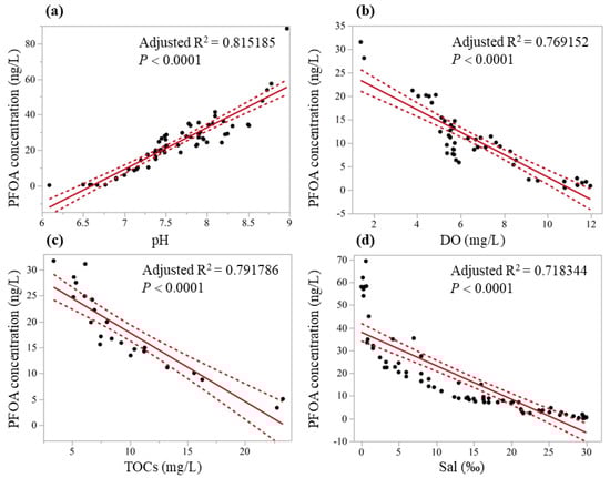 PFOS concentration responses to the effects of pH (a), DO (b), TOCs (c), and salinity (d).
