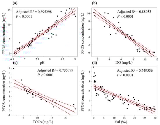 Description of the models that explain the relationships between mean concentrations of PFOS and pH, DO, pH, TOCs, and salinity (* represents a significant statistical difference).