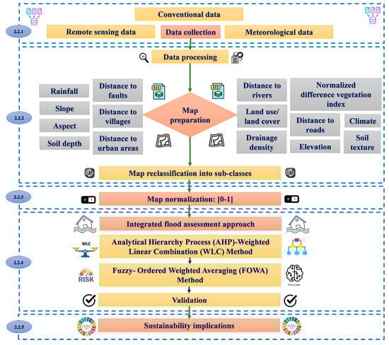 Flash floods are among the most destructive natural disasters, causing severe impacts on human life, infrastructure, and ecosystems [1,2]. Their rapid onset and destructive intensity have increased due to climate (CL) change and urbanization [3,4]. These events disrupt socio-economic systems, aggravate poverty, and result in lasting environmental damage [5]. Global reports estimate billions of dollars in losses and thousands of fatalities annually [6]. Addressing these challenges requires integrated flood management strategies aligned with the United Nations’ Sustainable Development Goals (SDGs) [7,8]. These goals promote resilient infrastructure, sustainable cities, and CL adaptation measures [9]. Thus, effective flood management is essential for reducing vulnerabilities and enhancing sustainable development in high-risk regions [10,11].