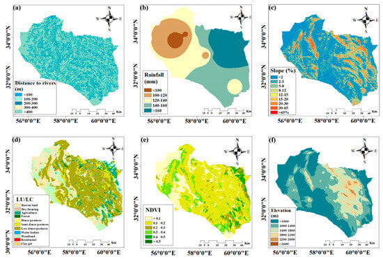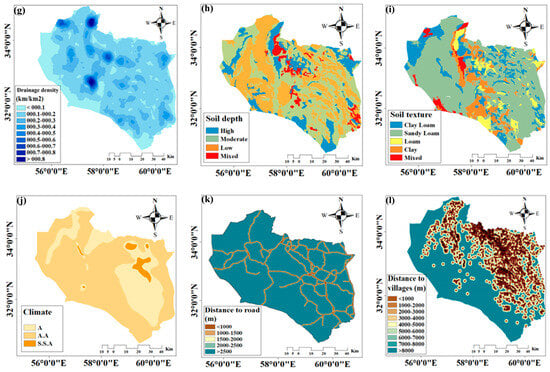 The DTD map was generated by buffering road networks at distances of <1000, 1000–1500, 1500–2000, 2000–2500, and >2500 m. This classification can reflect the impact of roads on altering natural drainage patterns. A similar methodology was applied by Mehrabi et al. [50].
