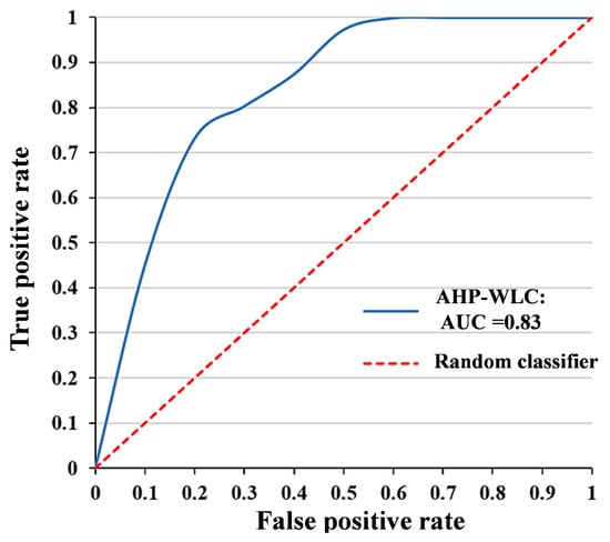 The validation process is a critical step in ensuring the accuracy and reliability of the IFAA framework, which integrates the AHP-WLC and the FOWA for flood susceptibility prediction. This study employed advanced tools and techniques, including TerrSet software (v20.01) and a comprehensive flood inventory dataset consisting of both flooded and non-flooded points, to assess the model’s performance in identifying flood-prone areas [61]. First, the AHP-WLC model was evaluated using the receiver operating characteristic (ROC) metric. The ROC metric utilizes the true positive rate (TPR) and the false positive rate (FPR) to measure the model’s accuracy. The area under the curve (AUC) of the ROC was calculated as follows [62]: