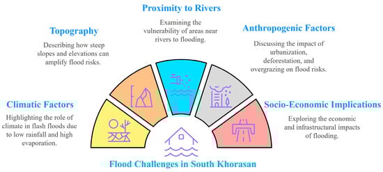 Floods are primarily driven by intense or prolonged rainfall (RF), topography, and human activities [2]. Urbanization and deforestation increase runoff by disrupting natural drainage and reducing soil permeability [12]. CL change adds to this complexity by causing irregular RF and intensifying hydrological variability [13]. Heavy or sustained RF can exceed river capacity, leading to overflow and flash floods [14]. These events are more severe in areas with poor drainage, unregulated development, and environmental degradation [15,16]. South Khorasan Province, Iran, is especially vulnerable due to its arid and semi-arid CL, steep terrain, and episodic RF [17]. Conventional flood mapping often fails to capture the interplay of environmental, climatic, and anthropogenic drivers [18]. Therefore, precise flood susceptibility assessment is essential [19]. Advanced, integrated approaches are needed to manage spatial variability and decision uncertainty [20]. Scenario-based tools can support better preparedness and resource allocation by addressing multiple risk dimensions and enhancing regional resilience [21].