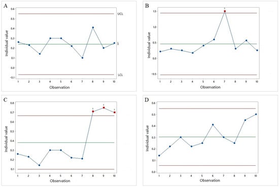 However, if there are non-random patterns that indicate instability or even points outside the control limits, there are indications that assignable causes act on the process. Ideally, a special cause should be assigned to each out-of-control point. Then, the points outside the limit are not included in the determination of the control limits, and a review of the control limits is conducted. This process was repeated until all points were under control [6]. However, sometimes it is not possible to assign a particular cause to out-of-control points. Montgomery [6] recommends keeping only one or two points, as this will not result in significant distortions of the control limits.