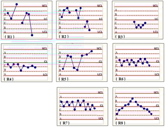According to Koutras et al. [20], once the control limits are established in Phase 1, the aim of Phase 2 is to monitor future data as to its state of statistical control. To do this, each observation is usually tested with the aid of a set of specific rules that help infer the existence of special causes. Shewart’s control charts have the disadvantage of ignoring information provided by entire sequences of points, as each plotted point only contains information from a single sample. This makes Shewart’s charts insensitive to small and medium process variations. To overcome this disadvantage, rules that increase the sensitivity of a graph can be used. These sensitizing rules make it possible to identify systematic patterns of imbalance in the sequence of points, which indicates a certain instability even if the samples assume values within the control limits [6].