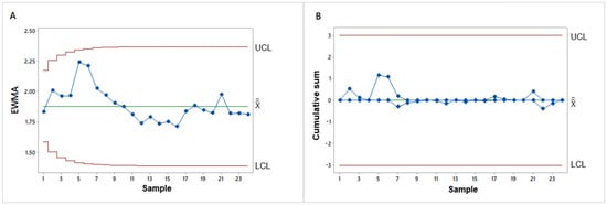 The EWMA chart allows for the accumulation of information based on successive weightings so that more recent observations are weighted more heavily than older ones [26]. Parameter λ, which varies from 0 to 1, determines the weighting criterion. The closer it is to 1, the less sensitive the graph is to detect small changes, and, therefore, the less influence older samples have. According to Montgomery [6], 0.05 ≤ λ ≤ 0.25 is generally used, with values of 0.05, 0.10, and 0.20 being recurrent choices. Figure 3A and Figure 3B show examples of EWMA and CUSUM graphs, respectively.